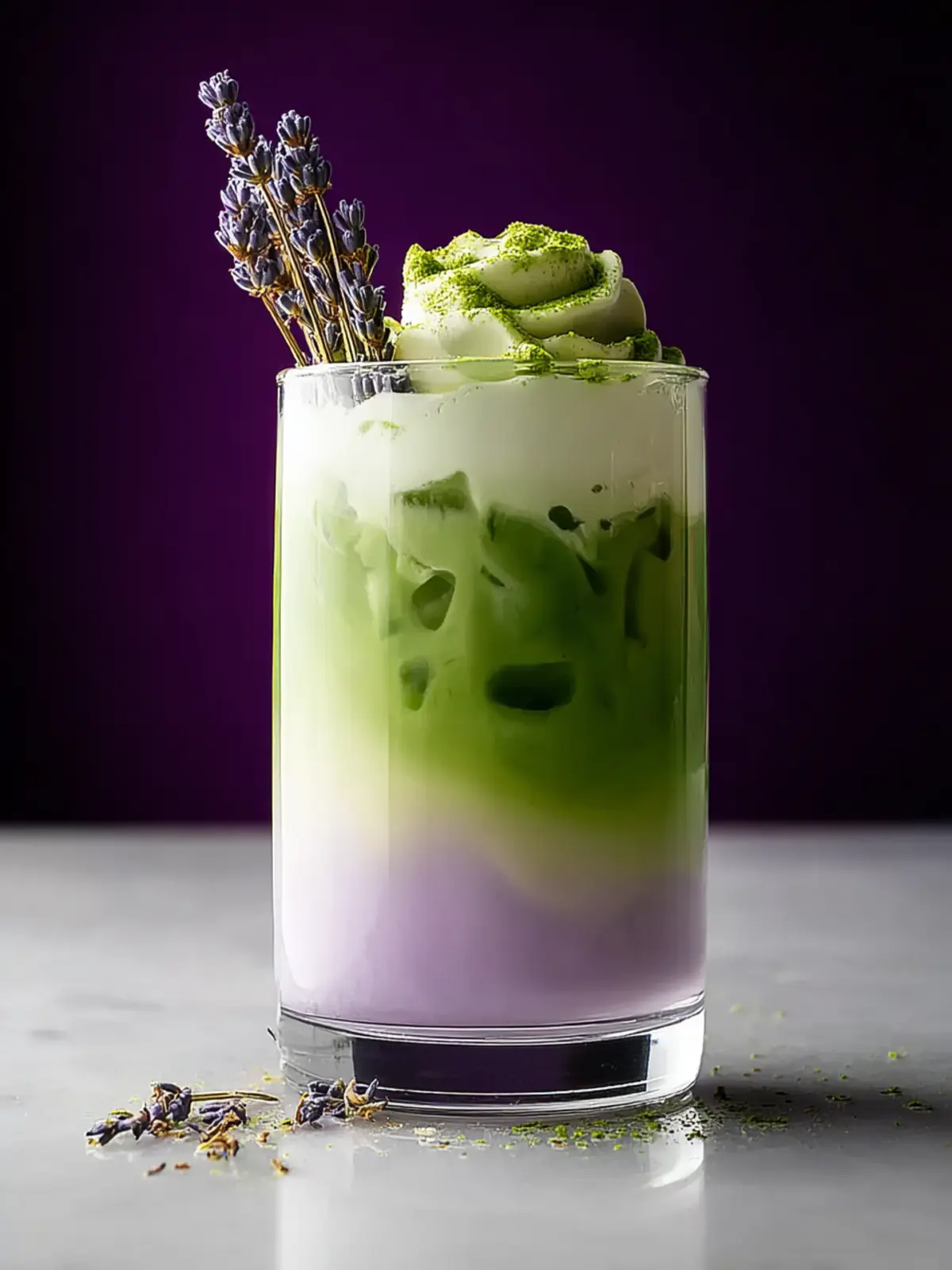 A refreshing and visually appealing Lavender Matcha Latte combining floral notes with vibrant matcha.