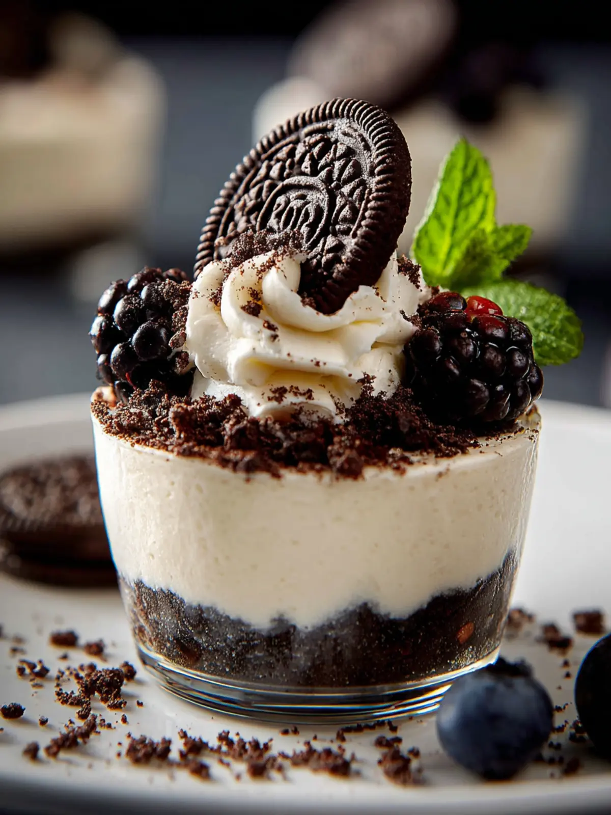 These delightful cups are not only a feast for the taste buds but also a feast for the eyes. The contrasting colors of the white cheesecake and the dark cookie crumble make them visually stunning. Plus, they’re easy to serve at parties or enjoy as a personal indulgence during a movie night at home—a guilty pleasure that leaves you wanting more.