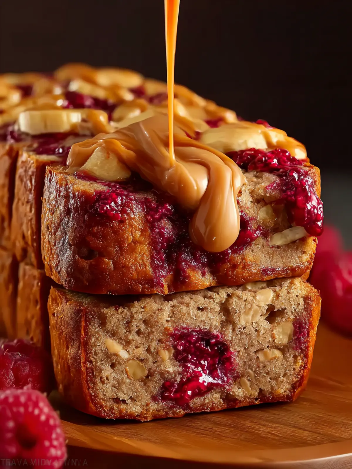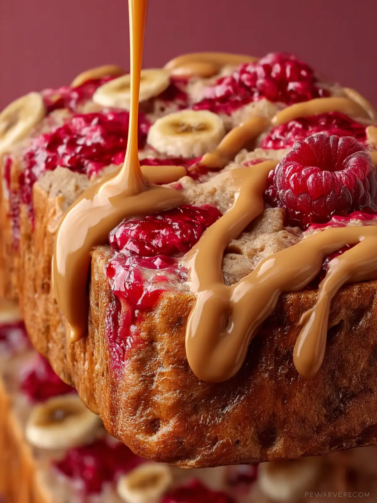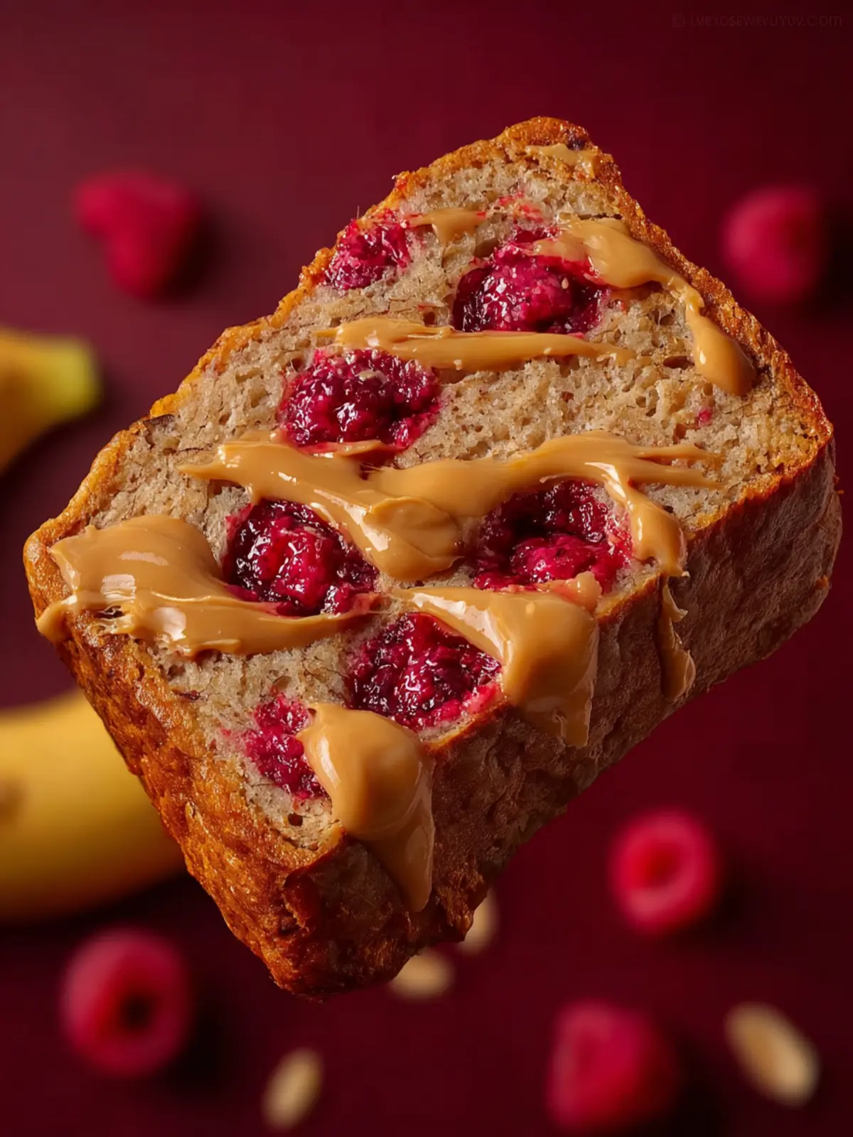 A deliciously moist banana bread with a peanut butter and jam swirl, perfect for breakfast or a snack.