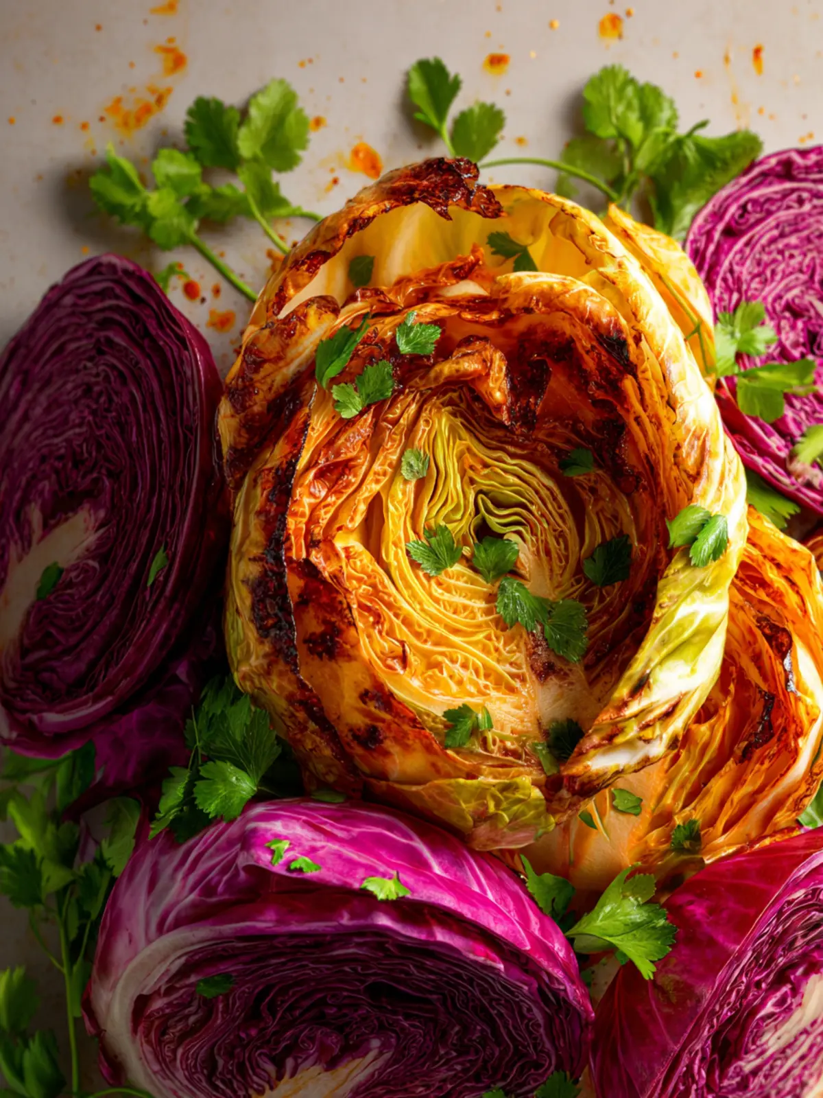 1. Preheat the oven to 385°F (196°C). Cut out the core of the cabbage, then make six 2-inch deep cuts from the base, going about a quarter of the way down. Drizzle the cabbage with oil and rub it in evenly.
